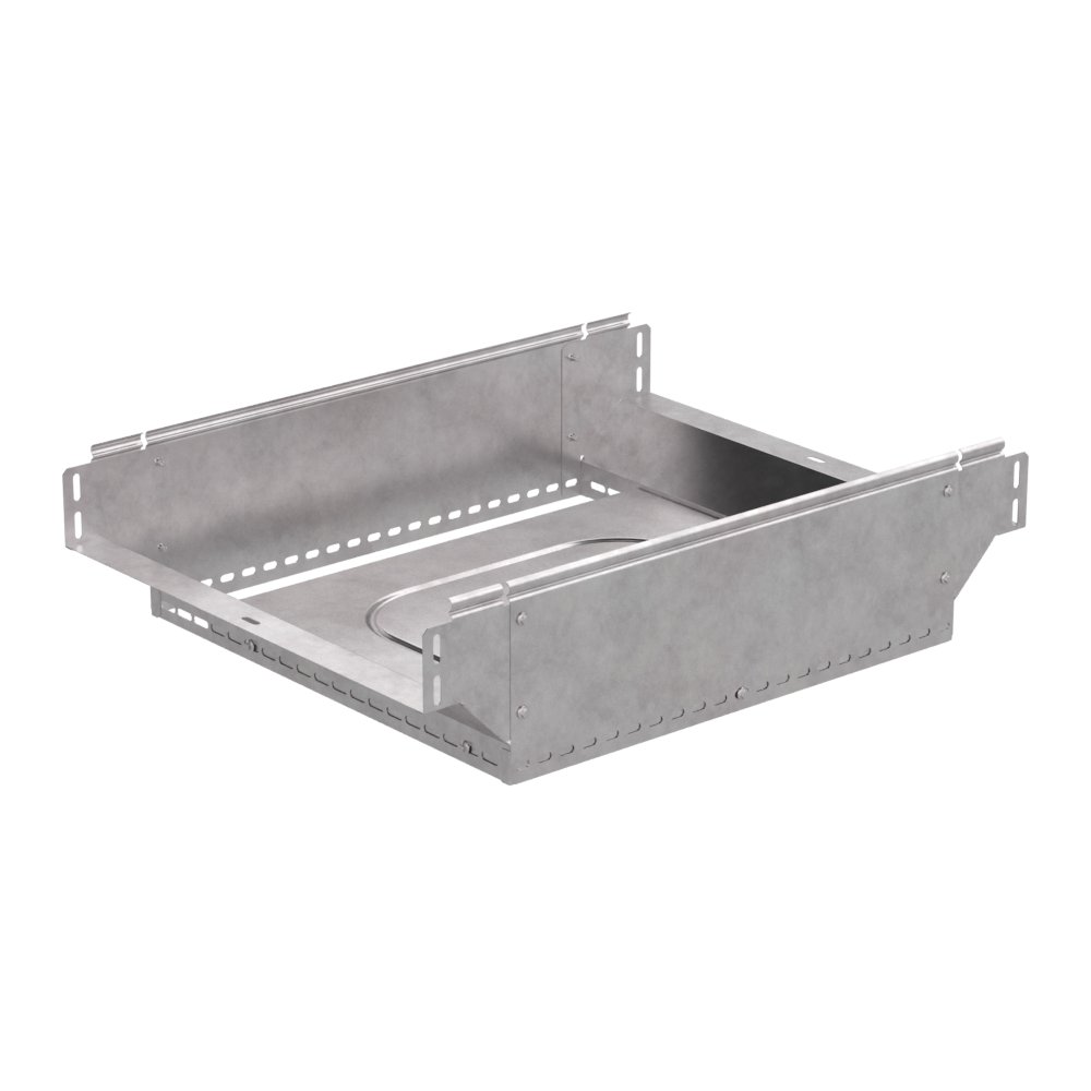 Аксессуары изготовленные из стали с защитным покрытием по методу Сендзимира – это изделия, на которых защитное цинковое покрытие было нанесено на листовую сталь перед изготовлением. Толщина защитного покрытия варьируется от 10 до 22мкм. Климатическое исполнение изделий УХЛ2, что предусматривают эксплуатацию в помещении и под навесом, при температуре эксплуатации от -80 до +150°С. Ответвитель Т-образный вертикальный применяется для обеспечения полноразмерного ответвления горизонтальной кабеленесущей системы из лотков металлических в вертикальном направлении.