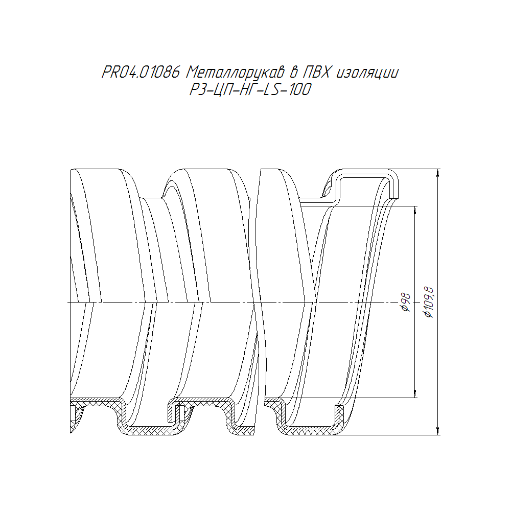 PR04.01086 металлорукав в ПВХ изоляции Р3-ЦП-НГ-LS-100 (8м/уп) Промрукав; оцинкованная сталь; IP66; 750 Н; монтаж -25...90 °C; эксплуатация -40...90 °C; 1,68476 кг/м.