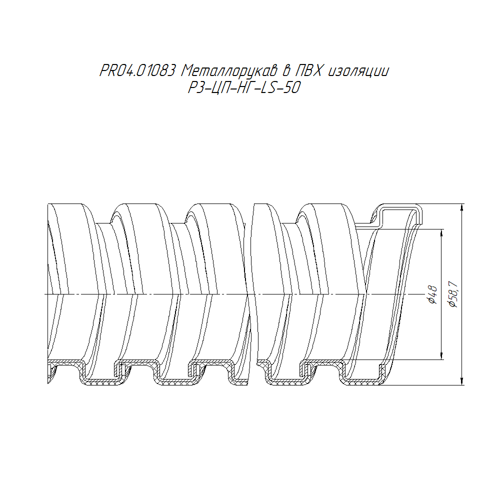 PR04.01083 металлорукав в ПВХ изоляции Р3-ЦП-НГ-LS-50 (15м/уп) Промрукав; оцинкованная сталь; IP66; 750 Н; монтаж -25...90 °C; эксплуатация -40...90 °C; 0,75638 кг/м.