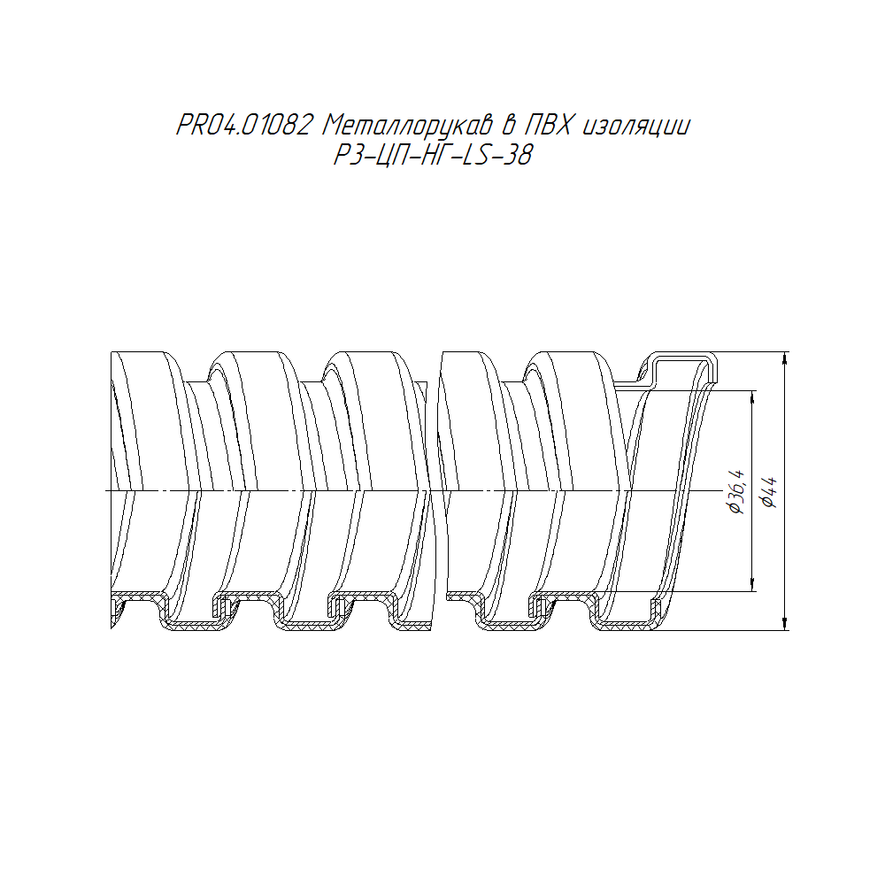 PR04.01082 металлорукав в ПВХ изоляции Р3-ЦП-НГ-LS-38 (25м/уп) Промрукав; оцинкованная сталь; IP66; 750 Н; монтаж -25...90 °C; эксплуатация -40...90 °C; 0,60636 кг/м.
