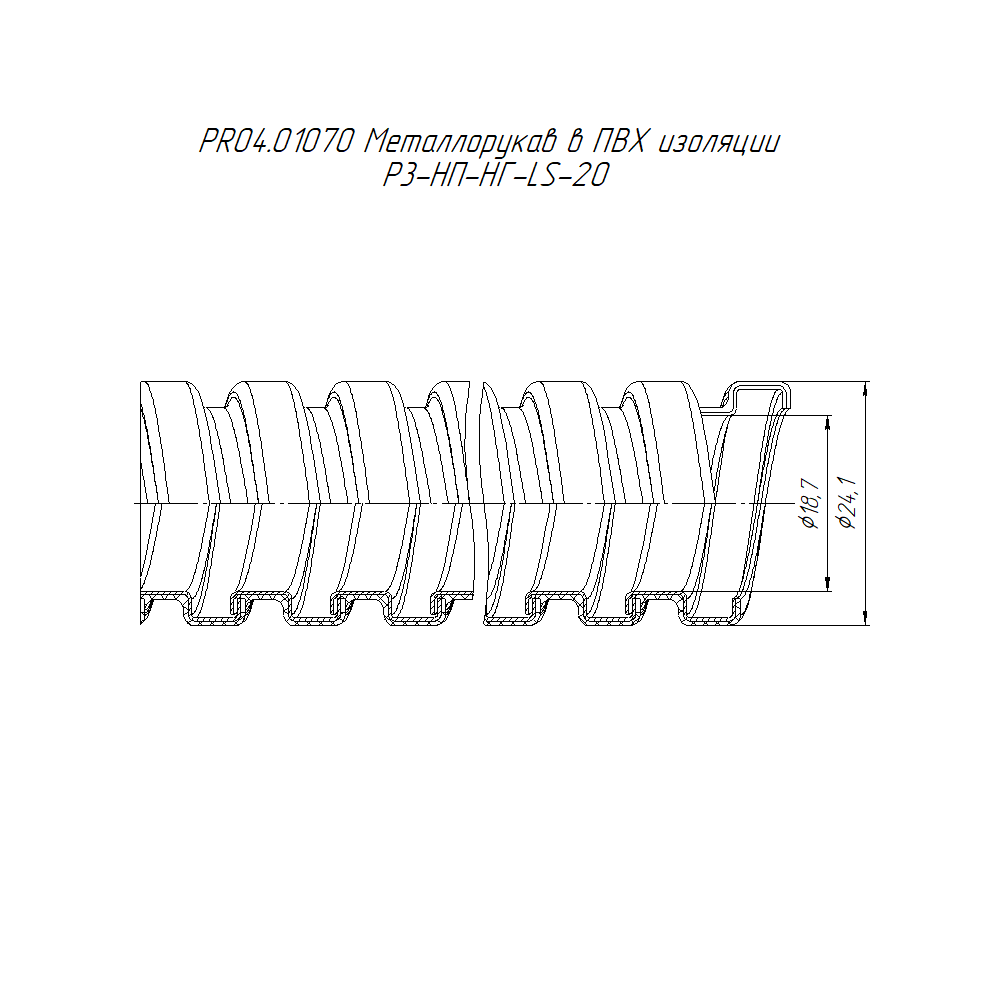 PR04.01070 металлорукав в ПВХ изоляции Р3-НП-НГ-LS-20 (50м/уп) Промрукав; нержавеющая сталь; IP66; монтаж -25...90 °C; эксплуатация -25...90 °C; 0,24563 кг/м.