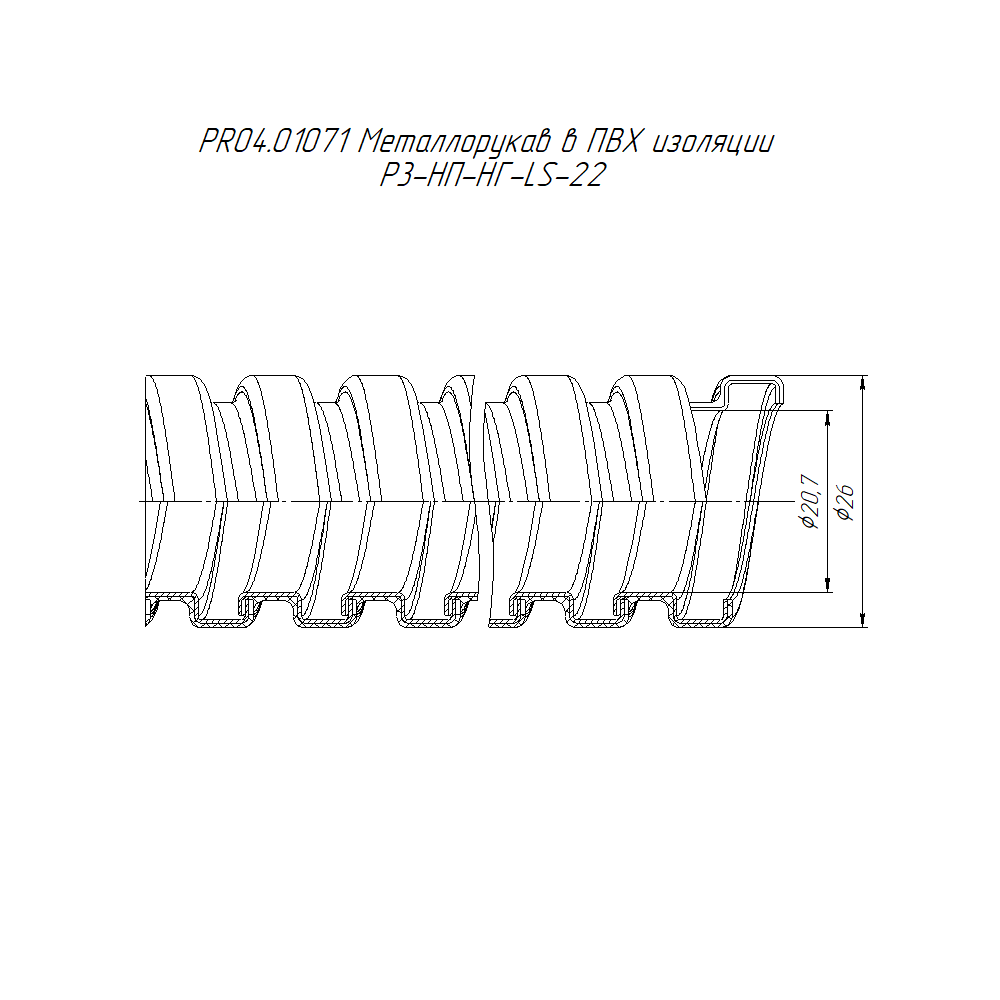 PR04.01071 металлорукав в ПВХ изоляции Р3-НП-НГ-LS-22 (50м/уп) Промрукав; нержавеющая сталь; IP66; 750 Н; монтаж -25...90 °C; эксплуатация -40...90 °C; 0,2673 кг/м.