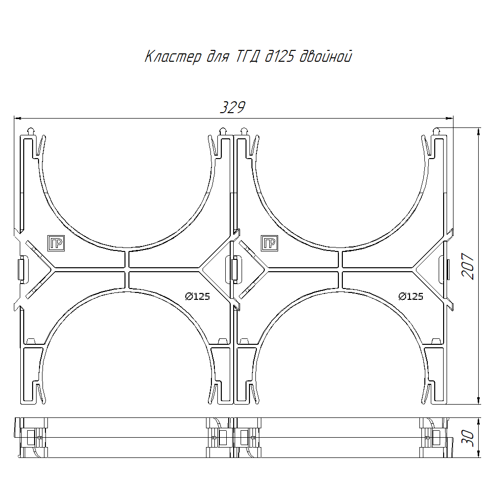 PR13.02572 кластер для двустенных труб d125 мм, двойной, двухсторонний (60 шт/кор) Промрукав; диаметр 125мм; RAL 9005; -55..90°C; 0,2197 кг.