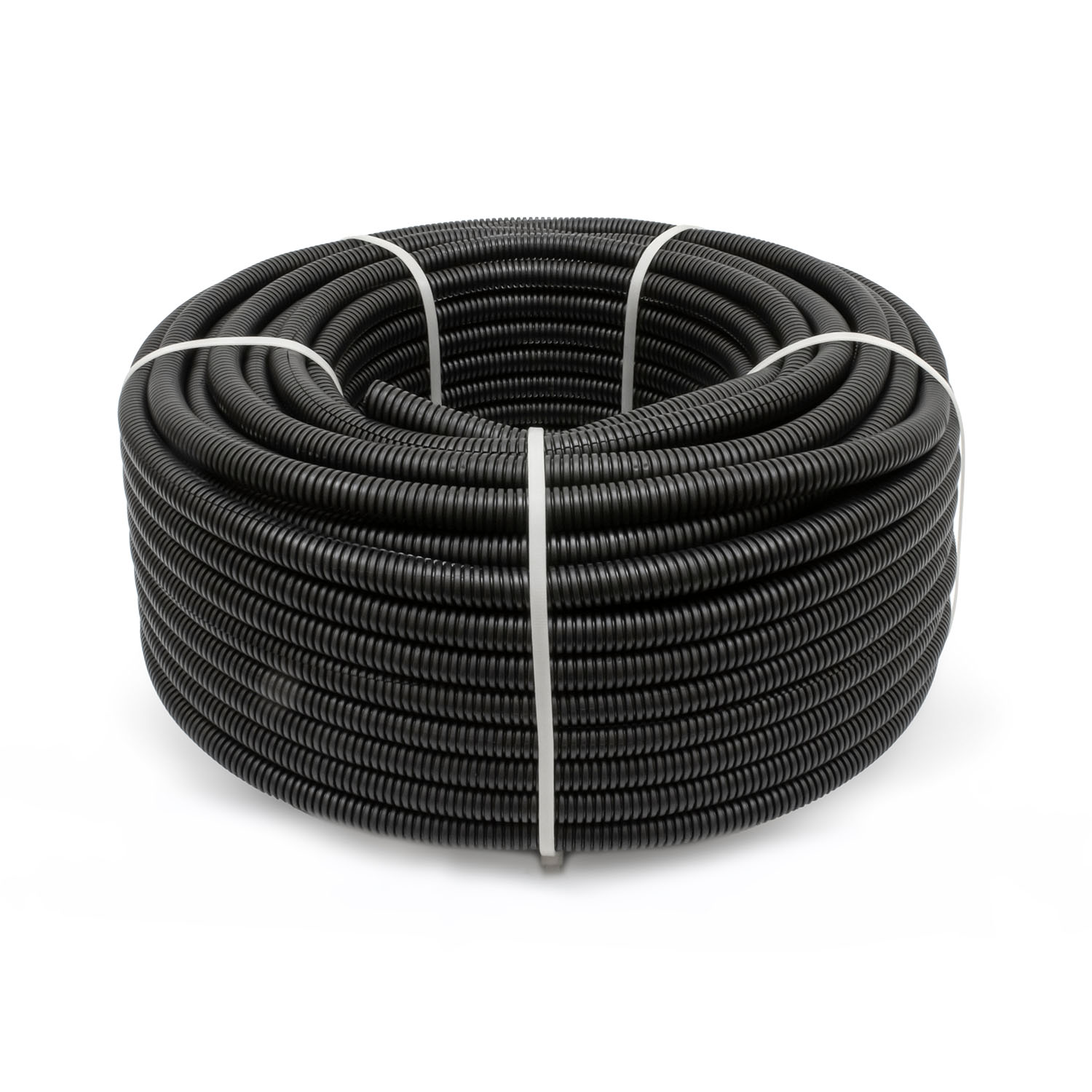 PR02.0314 труба гофрированная ПА безгалогенная (HF) стойкая к ультрафиолету разрезная черная dвн 9,8 мм, dнар 13,2 мм (50м/уп) Промрукав; IP20; полиамид 6; монтаж -40...120 °C; эксплуатация -60...157 °C; 0,02574 кг.