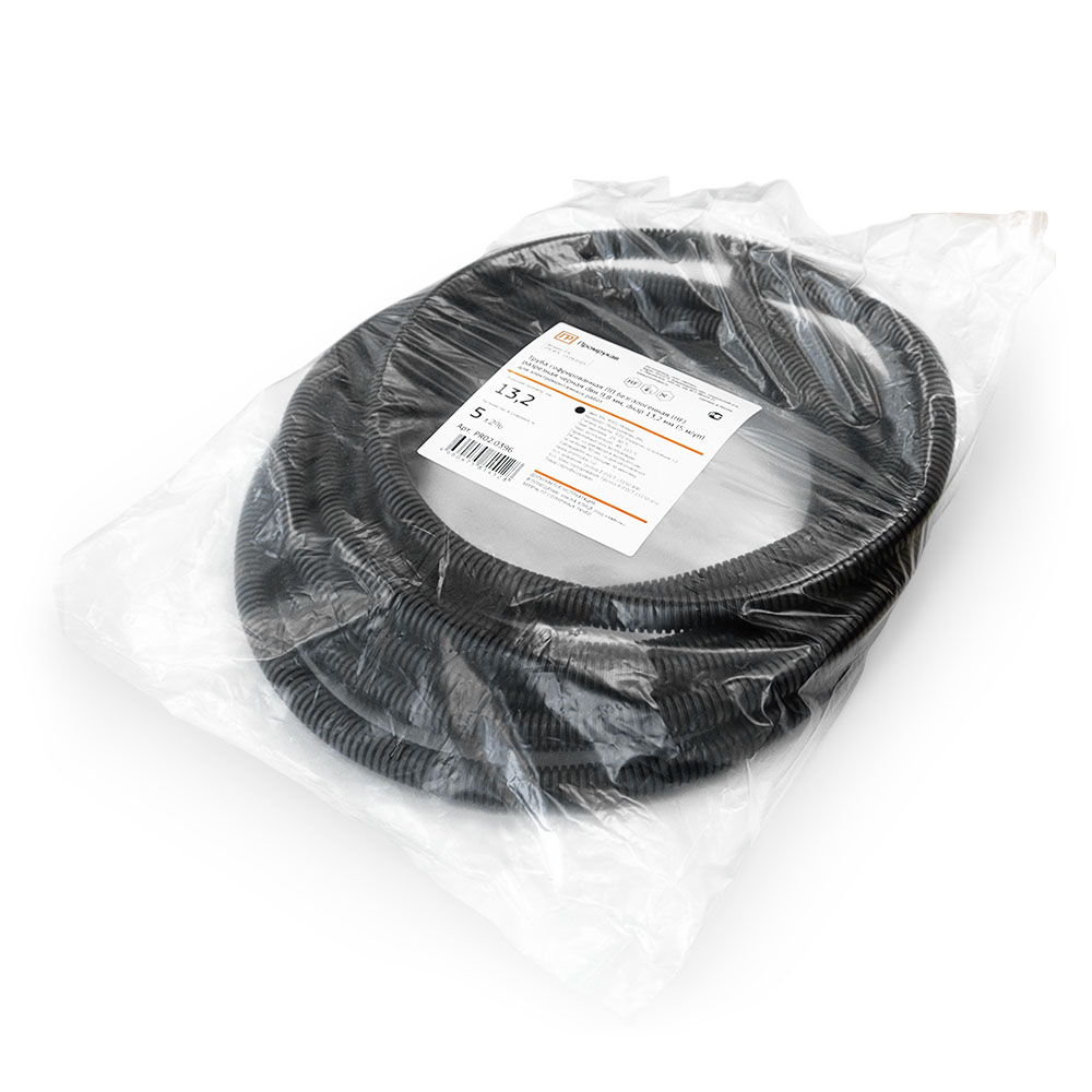 PR02.0396 труба гофрированная ПП легкая безгалогенная (HF) разрезная чёрная dвн 9,8 мм, dнар 13,2 мм (5м/уп) Промрукав; полипропилен (PP); диаметр 13,2 мм; IP20; монтаж -25...60 °C; эксплуатация -45...115 °C; 0,023 кг/м.
