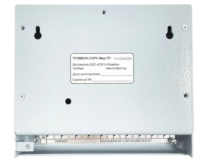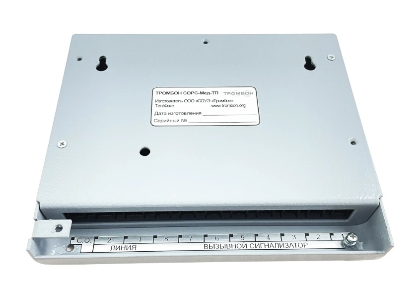 СОРС-Мед-ТП терминал палатный Тромбон; IP00; макс. кол-во подключаемых вызывных устройст 8; потребляемая мощность 0,4 Вт; напряжение питания 12-36 В; +5...+40°C; 165х190х33 ММ; 1 кг.
