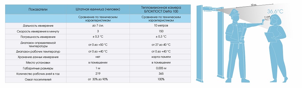 Бинокулярная тепловизионная видеокамера Delta 100 в реальном времени определяет потенциально нездоровых посетителей с расстояния от 1 до 10 метров (при хорошем освещении), распознает и фиксирует их лица (в т. ч. в масках и очках), подает сигнал тревоги охране. Данные с тепловизора передаются напрямую на монитор, без использования сервера, регистратора или СКУД. На экране монитора выводится видеоизображение и ИК-изображение, а также численные значения температур. При этом выводятся лишь те тревожные события, которые относятся к передвигающимся через зону контроля объекта.
