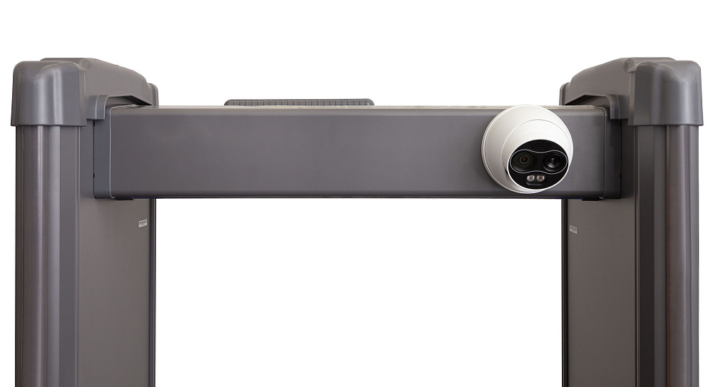 Термографическая камера, установленная на металлодетекторе, фиксирует температуру человека по целевой точке на лице. Оптимальное расстояние для измерения температуры – до 1,5 метров. В камере задействовано два объектива: оптический и тепловизионный. Изображение с них можно просматривать либо по очереди, либо в формате наложения двух кадров, либо в формате «оверлея» (картинка в картинке). При подключении регистратора можно также настроить функцию распознавания лиц и работы с базами данных. Результаты измерений тепловизора и зона обзора камеры отображаются на мониторе сотрудника охраны. Также на блоке управления металлодетектора фиксируется количество проходов, тревог, людей с нормальной и повышенной температурой.
