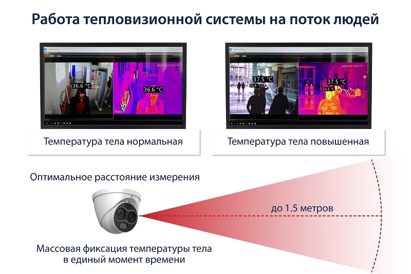Тепловизионная камера способна одновременно измерять температуру тела входящих людей на расстоянии 1,5 метра в течение 1 секунды. Досмотровый пост оборудован дисплеем и монитором, с помощью которого охранные службы могут осуществлять мониторинг входящих посетителей в режиме реального времени. Программное обеспечение для сбора, аналитики, а также хранения в памяти базы данных фиксирует информацию о количестве людей с наличием металлических предметов и повышенной температурой.