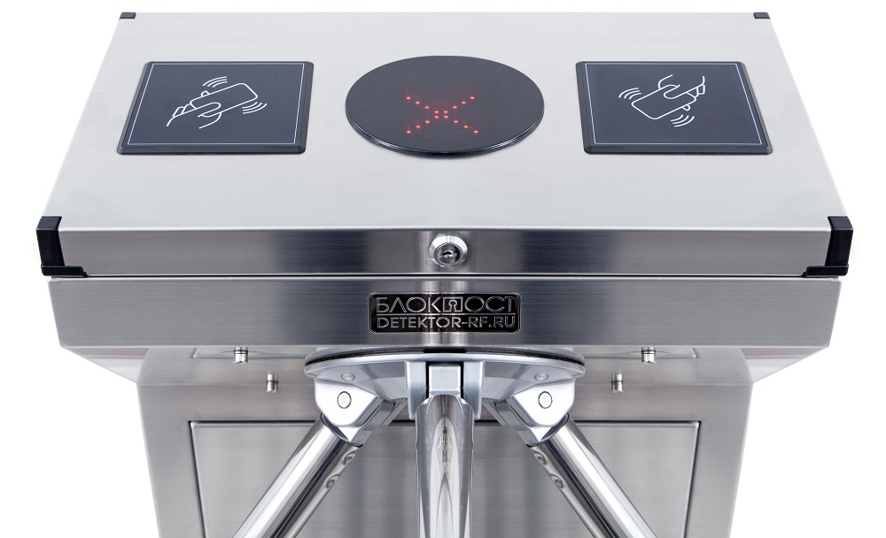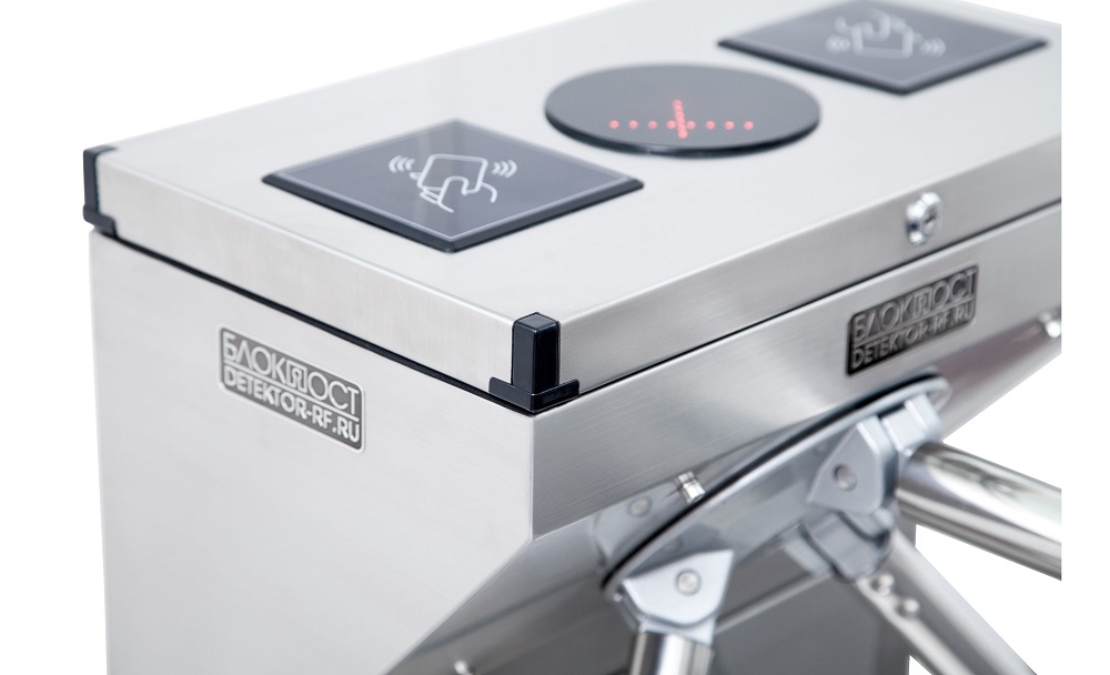 Контактный считыватель карт входит в базовую комплектацию турникета. Организация проходных с использованием устройств идентификации позволит наиболее быстро и точно определить возможность допуска человека через досмотровую зону без участия сотрудников охранной системы.