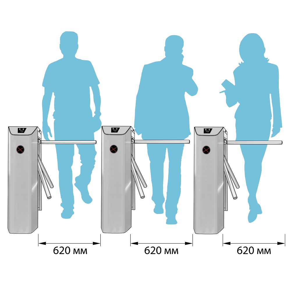 При обустройстве входной зоны тумбовые турникеты-триподы серии ТМБ рекомендуется располагать параллельно друг другу в одну линию. Расстояние между турникетами, в зависимости от размера пропускной штанги, может подвергаться модификации.