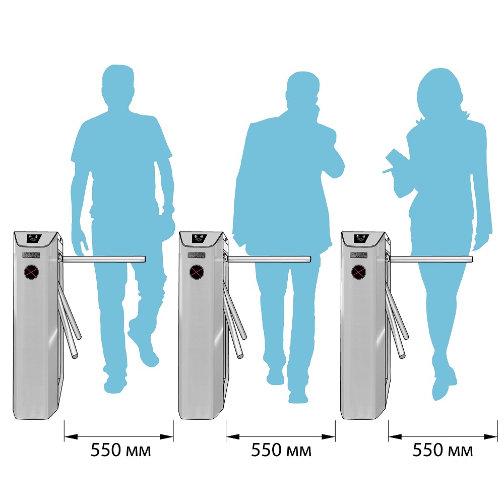 При обустройстве входной зоны тумбовые турникеты-триподы серии ТМБ рекомендуется располагать параллельно друг другу в одну линию. Расстояние между турникетами, в зависимости от размера пропускной штанги, может подвергаться модификации.