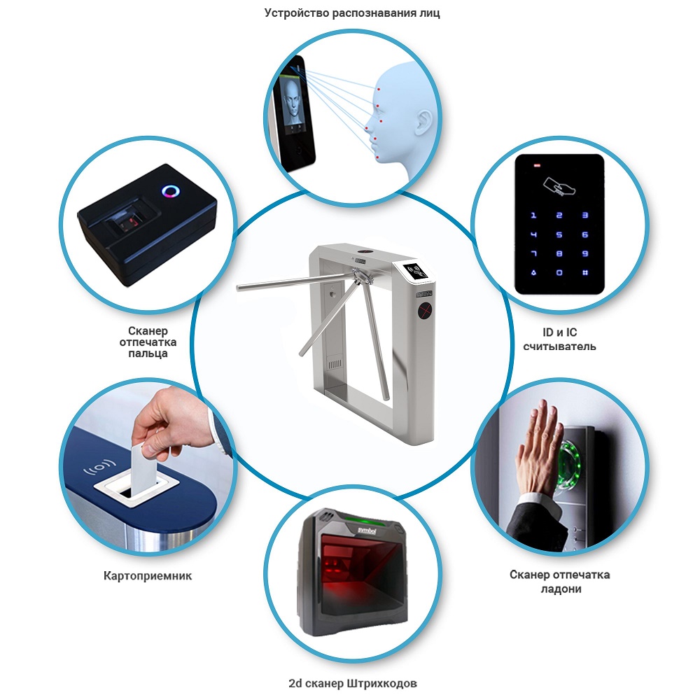 Турникет ТМБ 900 торговой марки БЛОКПОСТ можно оснастить устройствами распознавания пользователя: идентификатором лица, сканером отпечатка ладони/пальца, считывателем штрих-кода, картоприёмником. Контактный считыватель карт входит в базовую комплектацию турникета. Организация проходных с использованием устройств идентификации позволит наиболее быстро и точно определить возможность допуска человека через досмотровую зону без участия сотрудников охранной системы.