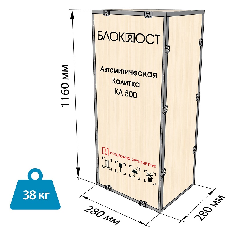 Индивидуальная упаковка служит для защиты оборудования от серьезных повреждений во время транспортировки и хранения. Упаковка представляет собой прочный деревянный короб. Внутри него пенопластовые перегородки располагаются между элементами оборудования и у внешних стенок. Калитку КЛ 500 можно перевозить в гермокабинах самолетов, автомобильным и железнодорожным транспортом. Устройство необходимо защитить от влаги, пыли и различных атмосферных осадков,
