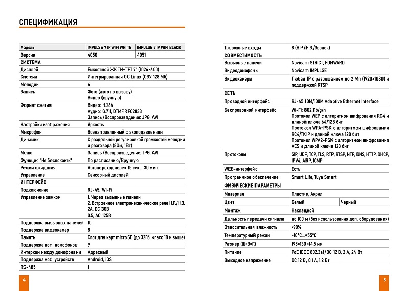 IP-видеодомофон Novicam IMPULSE 7 IP WIFI предназначен для организации аудио и видео системы посредством компьютерной сети. Важной особенностью видеодомофона является поддержка универсального SIP-протокола, который без каких-либо ограничений позволяет объединить в большую распределенную систему не только домофоны, но и IP-телефонию со всевозможными программными клиентами для компьютеров и мобильных устройств. Видеодомофон поддерживает 10 вызывных панелей, 8 каналов видео с IP-камер или видеорегистраторов, а также 9 дополнительных видеодомофонов. IP-домофон оснащён 7" дисплеем с сенсорным управлением, микрофоном с эхоподавлением и динамиком. При наличии предустановленной microSD карты памяти видеодомофон умеет сохранять в журнале событий фото каждого вызова, а также по желанию видео сеансов связи. Кроме этого, устройство может иметь охранные функции. Для этого к домофону можно подключить до 8 всевозможных датчиков. Устройство имеет русскоязычный графический интерфейс, в котором можно управлять всеми функциями и настройками, а для удаленного администрирования предусмотрен WEB-интерфейс. Видеодомофон Novicam IMPULSE 7 IP WIFI имеет встроенный Wi-Fi модуль для обеспечения беспроводного соединения в местах, где проводное подключение по каким-либо причинам невозможно. Питание устройства может осуществляться как от внешнего источника питания со стандартным напряжением 12В, а также от коммутатора по технологии PoE. IP-видеодомофон станет незаменимым помощником по обеспечению безопасности и контроля доступа в магазинах, складах, квартирах, загородных домах, офисах и прекрасно впишется в любой интерьер благодаря двум цветовым решениям.
