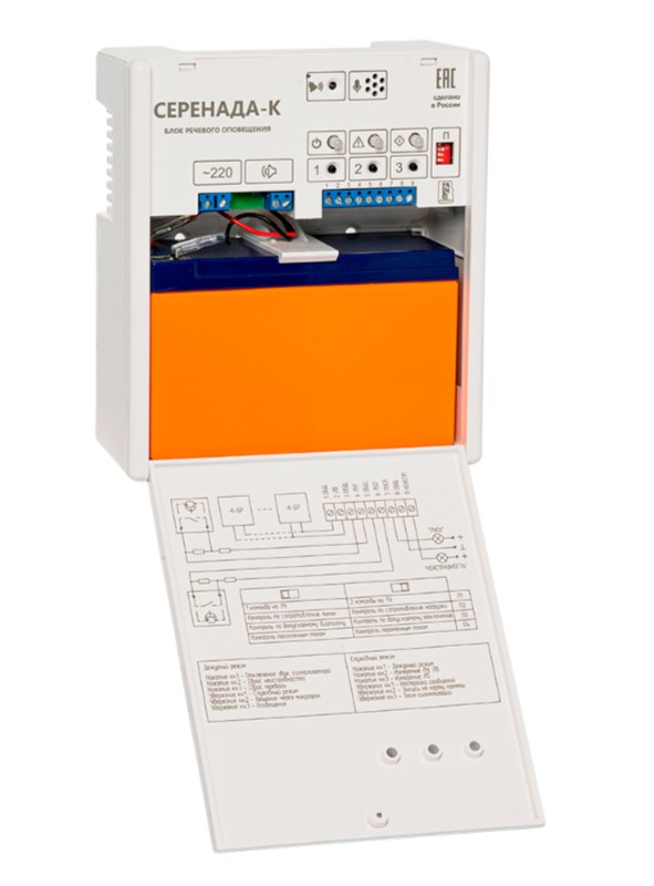 Серенада-К блок речевого оповещения SLT; напряжение питания от аккумулятора 9...15 В; номинальная выходная мощность 30 Вт; номинальная емкость встраиваемого аккумулятора 7 А·ч; диапазон воспроизводимых частот 200...5000 Гц; IP30; 0...40 °С; 200х180х80 мм; не более 0,5 кг.