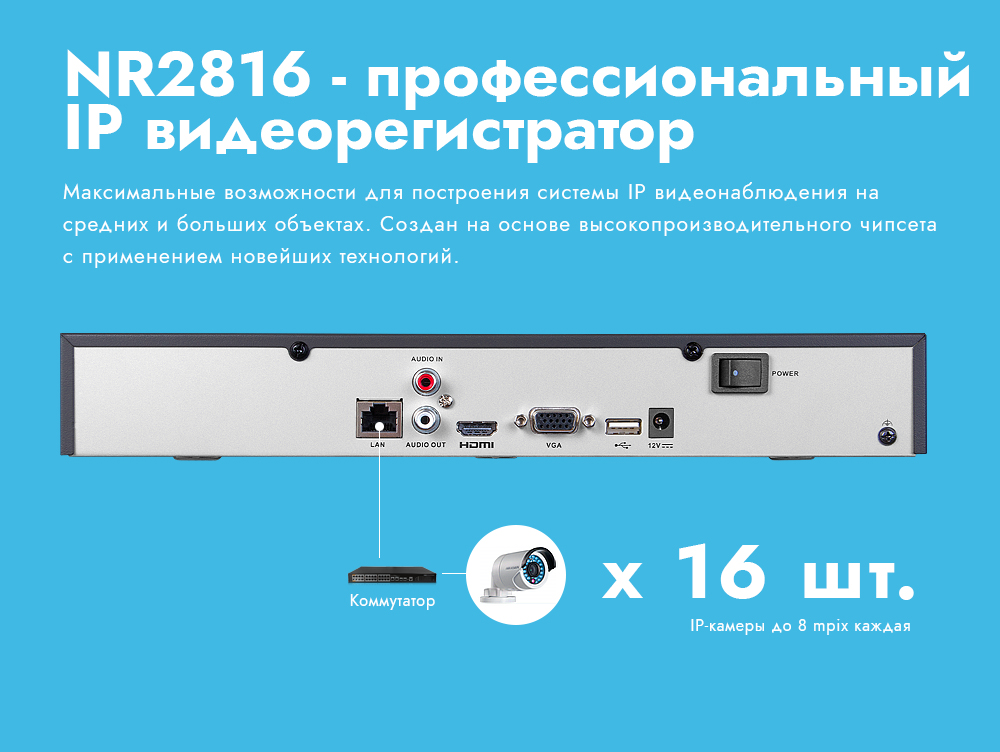 IP видеорегистратор NR2816 легко и удобно эксплуатировать благодаря инновационным решениям, таким как: работа с монитором в разрешении до 4K; видеоархив до 20Тб; интуитивно понятное графическое меню и поддержка всех современных операционных систем (включая мобильные). Запись всех каналов ведётся в любом поддерживаемом разрешении и реальном времени. При этом общий записываемый поток определяется входным потоком регистратора.