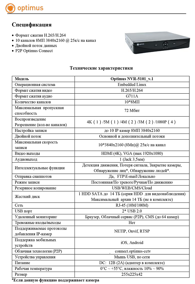 Сетевой видеорегистратор Optimus NVR-5101_V.1 сочетает высокопроизводительный процессор обработки видеоданных и встроенную операционную систему Embedded Linux.