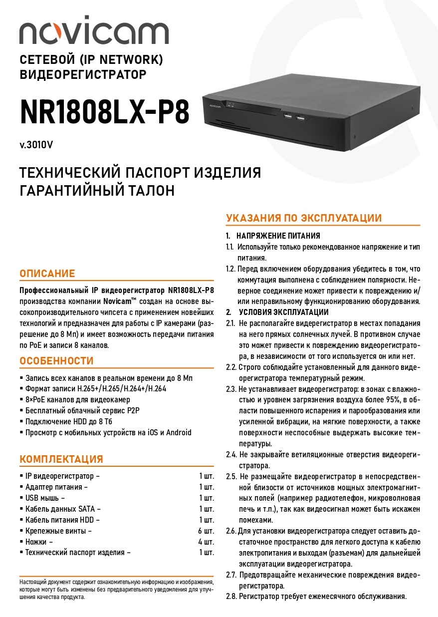 NR1808LX-P8 (v.3010V) PRO IP-видеорегистратор 8-ми канальный NOVIcam; 8 каналов, 8 Mpix; 8 x 8 Мп (3840×2160),6 Мп (3072х2048), 5 Мп (2560×1920), 4 Мп (2560x1440), 1080p (1920x1080),720p (1280x720)x25/30 к/с; ONVIF; поддержка HDD : SATA 1х3,5" х 8ТБ; формат записи H.265+,H.265, H.264+, H.264; 1 × RCA; 8 x PoE каналов для видеокамер; Р2Р; -10°C ~ +55°C; 255x47.5x235.1 мм.
