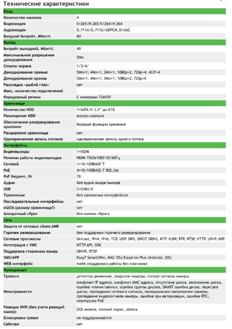 TC-R3104 Spec:I/B/P4/C/Eu/L/S IP-видеорегистратор 4-х канальный Tiandy; входной/выходной битрейт 60/40 Мбит/c; S+265/H.265/S+264/H.264; 1×SATA III 3.5" до 6 ТБ; 1×HDMI; 2×USB2.0; ONVIF; 4×10/100BASE-T 802.3at; детектор движения; AC220В/DC48В, 1A; -10°С...+55°С; 43×201.1×200.55 мм; 0.85 кг.