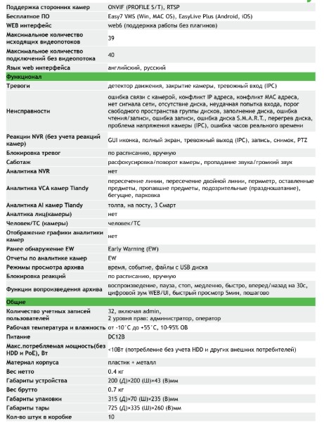 TC-R3110 Spec:I/B/L/Eu/V1.1 IP видеорегистратор 10-ти канальный Tiandy; входной/выходной битрейт 40/40 Мбит/c; S+265/H.265/H.264; 1 SATA до 8 ТБ; HDMI , VGA; USBх2; 1хRJ45 10M/100M Ethernet; ONVIF; DC12V 1.5A; -10°C...+55°C; 42.9х200х199.5 мм; 0.4 кг.