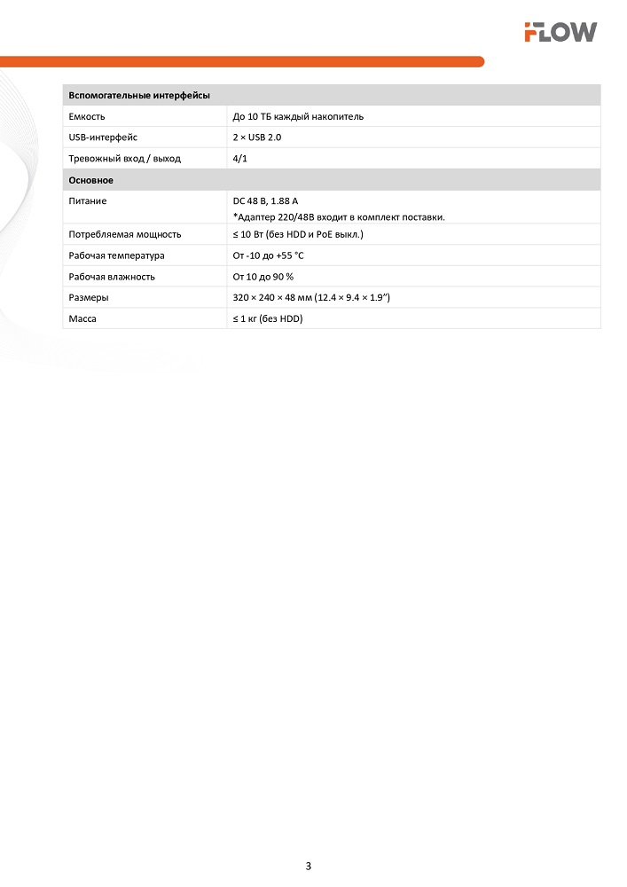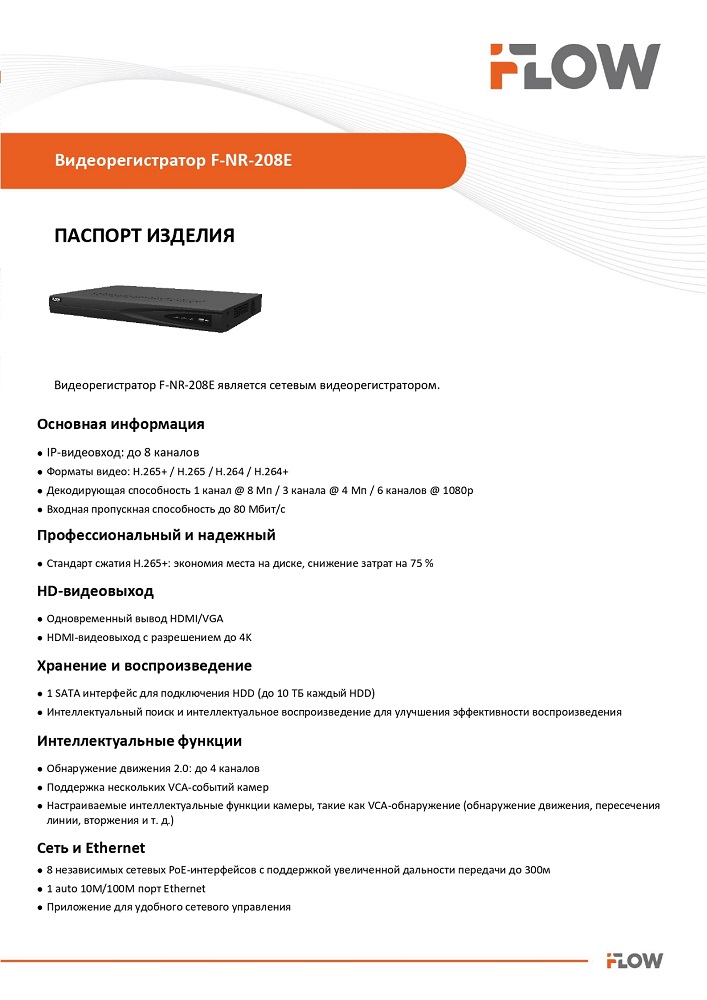 F-NR-208E 8-ми канальный IP-регистратор c 8-ю PoE интерфейсами iFlow; видеовход: 8 IP@8Мп; 1 канал RCA; 1 VGA и 1 HDMI до 4К; H.265+/H.265/H.264+/H.264; 80 Мбит/с; разрешение записи: до 8Мп. синхр.воспр. 1 канал@8Мп, 3 канала@4Мп, 6 каналов@1080P; обнаружение движения 2.0 (для 4х каналов); 1 SATA для HDD до 10Тб, 8 независимых PoE интерфейса 10/100M; IEEE 802.3 af/at, бюджет PoE 75Вт, поддержка режима передачи до 300м,10Мбит/с, CAT6; 1 10/100M Ethernet интерфейс; трев. вход/выход 4/1, 2 х USB 2.0; -10°C до +55°C; 48В DC; 95Вт макс (без HDD), метал.