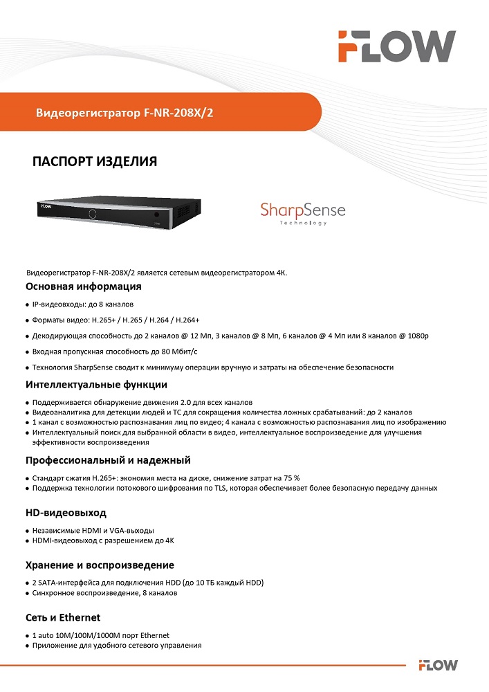 F-NR-208X/2 8-ми канальный IP-регистратор c технологией SharpSense iFlow; видеовход: 8 IP@12Мп; аудиовход: 1 канал RCA; видеовыход: 1 VGA до 1080p, 1 HDMI до 4К (независимые); H.265+/ H.265/ H.264+/ H.264; входящий поток 80Мб/с; исходящий поток 160Мб/с; разрешение записи до 12Мп; синхр.воспр. 2 канала @12Мп, 3 канала @8Мп, 6 каналов@4Мп, 8 каналов@2Мп; 2 SATA для HDD, до 10Тб каждый диск; тревожные вход/выход 4/1, 1 10/100/1000M Ethernet; 2 USB 2.0; -10°C...+55°C; DC12В; 15Вт макс (без HDD), ≤1 кг (без HDD). метал.