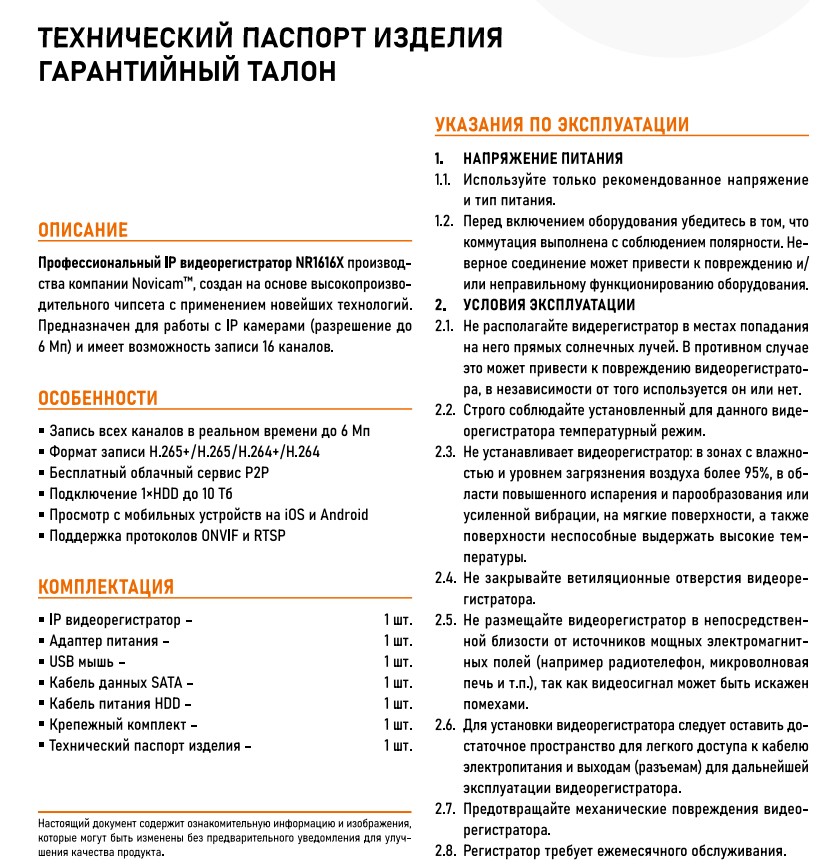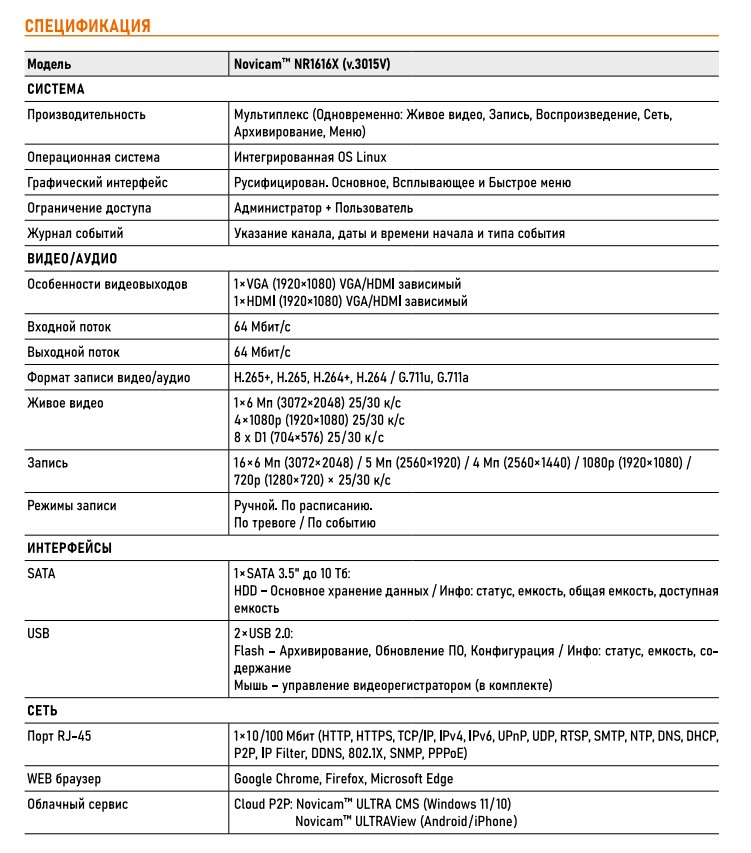 NR1616X (v.3015V) IP видеорегистратор 16-ти канальный Novicam; Novicam UltraView; 1xSATA 3,5" до 10Тб; 1x6 Мп (3072х2048) 25/30 к/с; 4х1080p (1920x1080) 25/30 к/с; 16хD1 (704×576) 25/30 к/с; H.265+/H.265/H.264+/H.264; ONVIF, RTSP; облачный сервис Р2Р; HDD до 10 Тб; -10°C~+55°C; 254.5x43.9x224.4 мм; 300 г.