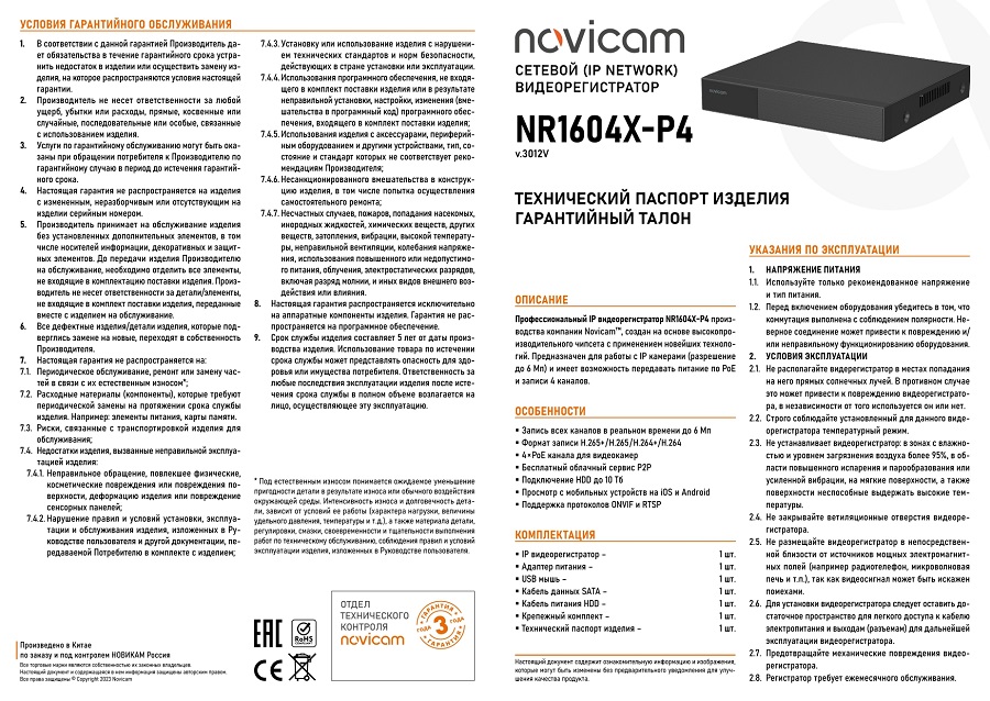 NR1604X-P4 (ver.3012V) 4-х канальный IP видеорегистратор c PoE Novicam; запись: 4x6 Мп (3072х2048)/5 Мп (2560×1920)/4 Мп (2560x1440)/1080p (1920x1080)/720p (1280x720) x 25/30 к/с; облачный сервис Р2Р; 4xPoE канала; 1xHDMI/1xVGA; H.265+,H.265, H.264+, H.264 / G.711u, G.711a совместно с видео (LAN); 1xSATA 3,5" до 10Тб; -10°C ~ +55°C; 254.5x43.9x224.4 мм.