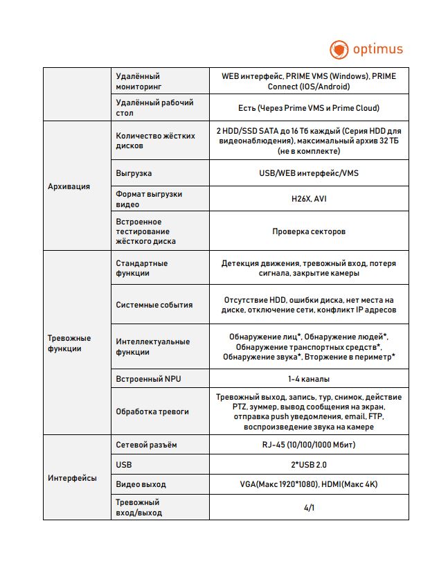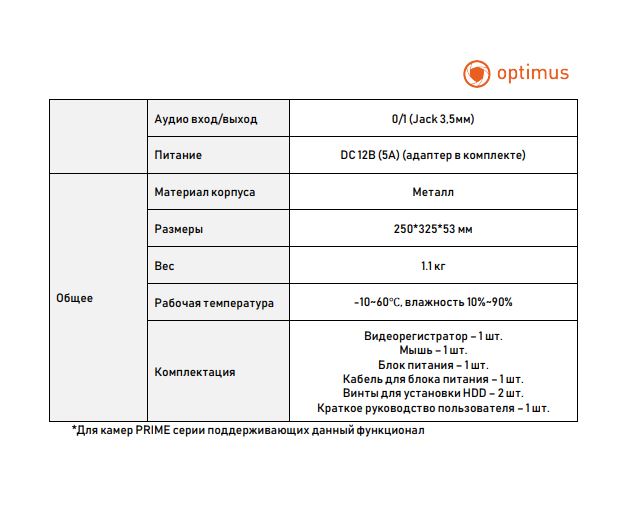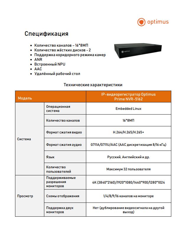 Prime NVR-5162 IP-видеорегистратор Optimus; 16*8МП; 2 жестких дисков; поддержка коридорного режима камер; ANR; встроенный NPU; AAC; 0/1 (Jack 3,5мм); удалённый рабочий стол; RJ-45 (10/100/1000 Мбит); 2 HDD/SSD SATA до 16 Тб каждый, максимум 32 ТБ(не в комплекте); 2*USB 2.0; VGA (Макс. 1920*1080), HDMI (Макс. 4K); металл; 250x325x53 мм; 1,1 кг.