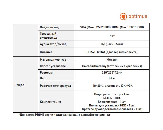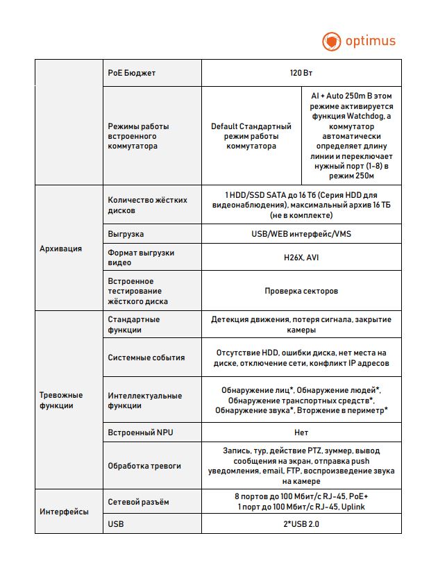 Максимальная пропускная способность составляет 75 Мбит (входящий и исходящий поток). Наилучшее качество отображения гарантируют выходы HDMI (Макс. 1920×1080) и VGA (Макс. 1920×1080). Возможность хранения данных обеспечивают форматы сжатия видео H.264 / H.265 / H.265+. Поддерживается функция ANR. Резервное копирование может производиться через USB, WEB-интерфейс, VMS. Видеорегистратор оснащён встроенным коммутатором с 8 PoE-портами (общий бюджет PoE 120 Вт, стандарт IEEE 802.3af/at) и 1 портом Uplink 100 Мбит/с. Режимы работы коммутатора: Default (стандартный) и AI + Auto 250m (автоматическое определение длины линии, активация Watchdog и переключение портов 1-8 в режим 250 м). Видеорегистратор обладает возможностями удаленного мониторинга: WEB-интерфейс, PRIME VMS (Windows), PRIME Connect (IOS/Android). Поддержка беспроводных сетей 4G и Wi-Fi при подключении внешнего адаптера (не входит в комплект поставки). Поддерживается облачный сервис prime.optimus-cctv.com. Есть поддержка коридорного режима камер и аудиоформата AAC.