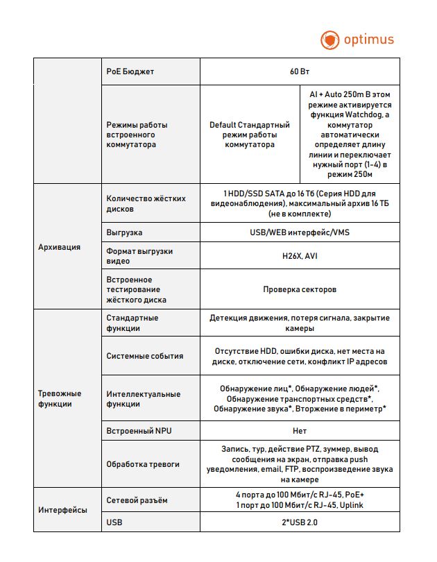 Максимальная пропускная способность составляет 75 Мбит (входящий и исходящий поток). Наилучшее качество отображения гарантируют выходы HDMI (Макс. 4K) и VGA (Макс. 1920×1080). Возможность хранения данных обеспечивают форматы сжатия видео H.264 / H.265 / H.265+. Поддерживается функция ANR. Резервное копирование может производиться через USB, WEB-интерфейс, VMS. Видеорегистратор оснащён встроенным коммутатором с 4 PoE-портами (общий бюджет PoE 60 Вт, стандарт IEEE 802.3af/at) и 1 портом Uplink 100 Мбит/с. Режимы работы коммутатора: Default (стандартный) и AI + Auto 250m (автоматическое определение длины линии, активация Watchdog и переключение портов 1-4 в режим 250 м). Видеорегистратор обладает возможностями удаленного мониторинга: WEB-интерфейс, PRIME VMS (Windows), PRIME Connect (IOS/Android). Поддержка беспроводных сетей 4G и Wi-Fi при подключении внешнего адаптера (не входит в комплект поставки). Поддерживается облачный сервис prime.optimus-cctv.com. Есть поддержка коридорного режима камер и аудиоформата AAC.
