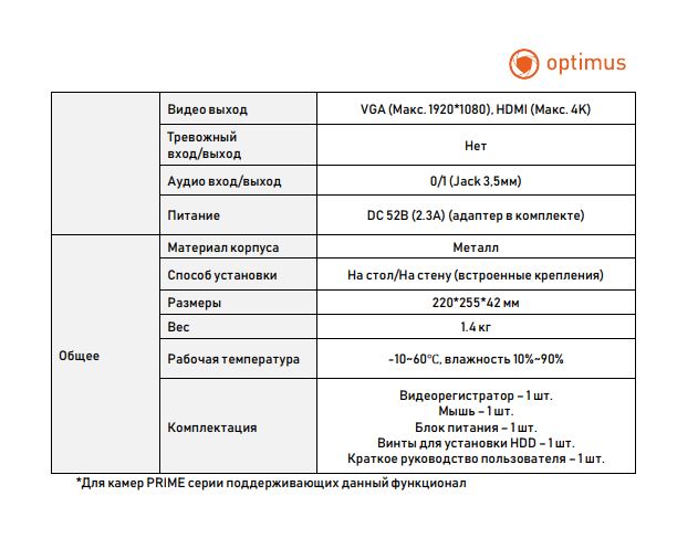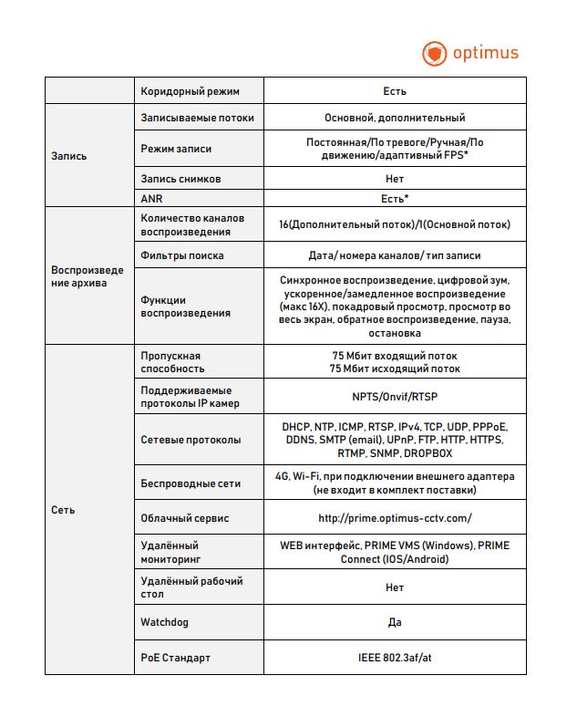 Максимальная пропускная способность составляет 75 Мбит (входящий и исходящий поток). Наилучшее качество отображения гарантируют выходы HDMI (Макс. 4K) и VGA (Макс. 1920×1080). Возможность хранения данных обеспечивают форматы сжатия видео H.264 / H.265 / H.265+. Поддерживается функция ANR. Резервное копирование может производиться через USB, WEB-интерфейс, VMS. Видеорегистратор оснащён встроенным коммутатором с 8 PoE-портами (общий бюджет PoE 120 Вт, стандарт IEEE 802.3af/at) и 1 портом Uplink 100 Мбит/с. Режимы работы коммутатора: Default (стандартный) и AI + Auto 250m (автоматическое определение длины линии, активация Watchdog и переключение портов 1-8 в режим 250 м). Видеорегистратор обладает возможностями удаленного мониторинга: WEB-интерфейс, PRIME VMS (Windows), PRIME Connect (IOS/Android). Поддержка беспроводных сетей 4G и Wi-Fi при подключении внешнего адаптера (не входит в комплект поставки). Поддерживается облачный сервис prime.optimus-cctv.com. Есть поддержка коридорного режима камер и аудиоформата AAC.