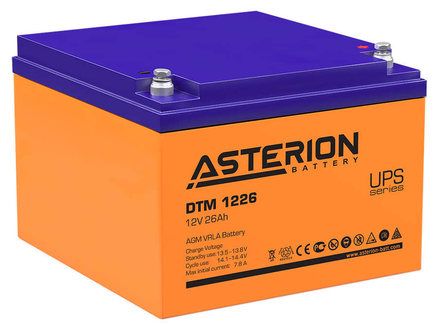 Свинцово-кислотные аккумуляторы серии DTM торговой марки ASTERION являются ярким примером герметичных необслуживаемых аккумуляторов с системой рекомбинации газов (VRLA), производимых по технологии AGM (поглощение электролита в сепараторе из стекловолокна). DTM - универсальная серия, рекомендованная для использования как в буферном, так и в циклическом режимах. Разработан для применения в мобильных и портативных устройствах и благодаря стабильно высокой однородности внутреннего сопротивления изделий идеально подходит для использования в резервных источниках питания и блоках.