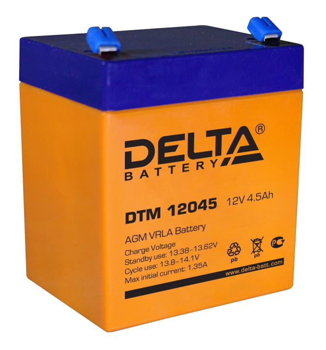 Аккумулятор Delta DTM 12045 (12В/4,5Ач) свинцово-кислотный, герметичный, ножевые клеммы 6,35 мм (F2), 90х70х101/107 мм, 1,65 кг.