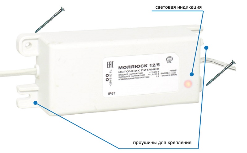 Моллюск 12/5 источник электропитания малогабаритный; 12 DC; 5 А; -30…+40 °С; 56х150х35 мм; 0,35 кг.