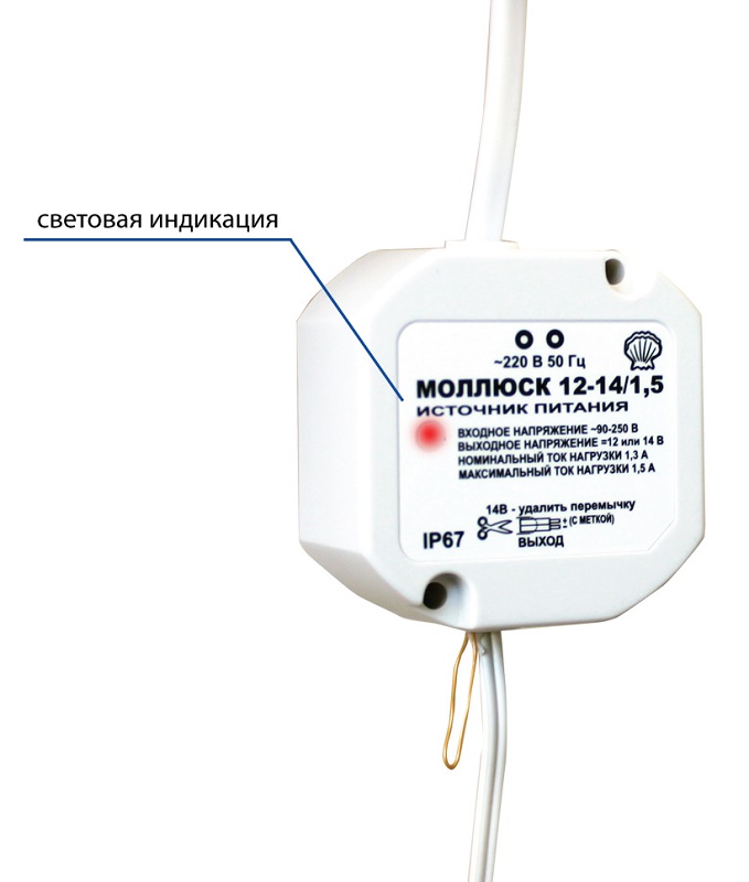 Моллюск12-14/1,5 источник вторичного электропитания; входное напряжение 90...250 В; выходное напряжение 12 или 14 В (выбирается удалением перемычки), максимальный ток нагрузки 1,5 А; световая индикация; защита от короткого замыкания; защита от перегрузки; IP67; 50х49х27 мм; 0,09 кг.