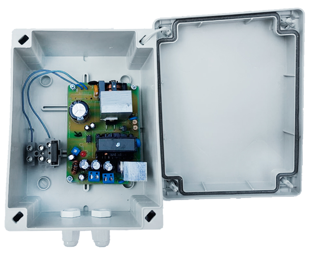 Источник вторичного электропитания импульсный 12В, 5А размещён в пластиковом корпусе со степенью защиты IP56 по ГОСТ 14254-94 и рассчитан на размещение на открытом воздухе.