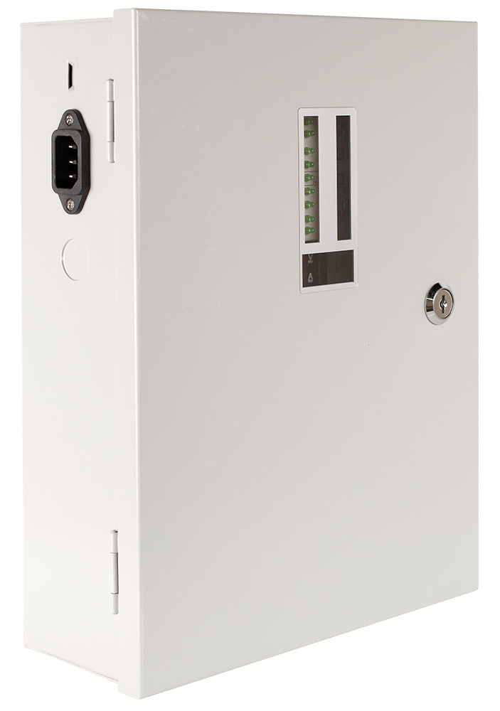 Профессиональный источник питания, создан на основе высоконадежных элементов нового поколения. Металлическое исполнение, в виде шкафа, позволяет легко и удобно монтировать благодаря продуманной конструкции. Все элементы размещены внутри корпуса, закрывающиеся на замок. Среди элементов присутствует распределительный блок, который позволяет подключать несколько устройств раздельно. Он помогает сделать коммутацию понятной и доступной, что делает обслуживание такой системой более комфортной. Данный источник питания незаменим при построении любых внутренних охранных систем.