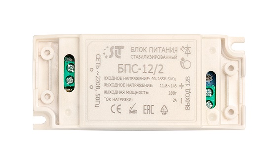 БПС-12/2 источник вторичного электропитания резервированный SLT; стабилизированный, пластиковый корпус, 12В; 2А; 90-265В 50Гц; 88х39х22; 0,06 кг.