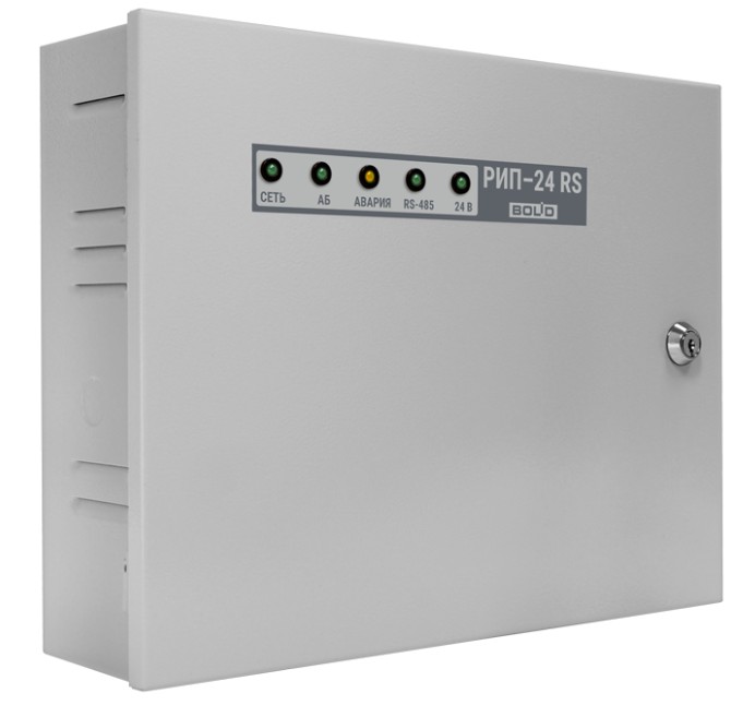 24В; 2А (мах 2.5А); емкость АБ 2*7Ач; световая индикация; звуковая сигнализация; датчик вскрытия корпуса; защита: от перенапряжения, от КЗ, от переполюсовки АБ; интерфейс RS-485.