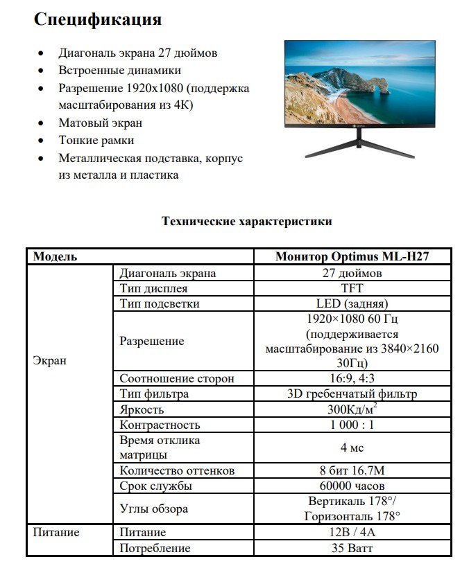 ML-H27 монитор Optimus; 27 дюймов; разрешение 1920x1080; встроенные динамики; матовый экран; настольный/настенный; яркость 300 кд/м2; 3D гребенчатый фильтр; металл/пластик; потребляемая мощность 35 Вт; DC 12V, 4А; 0...+50℃; 617×366×40 мм; 3.4 кг.