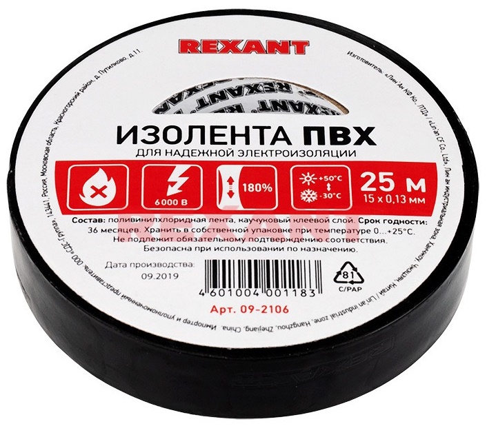 ¶Изолента ПВХ REXANT 15 мм х 25 м, черная, упаковка 5 роликов (09-2106); -30...+50 °С; лента ПВХ, клеевой слой; 15х25 мм; толщина 0,13 мм.