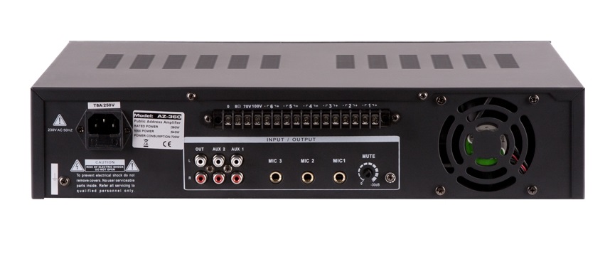 AZ-360 трансляционный зональный усилитель; 360 Вт; 6 зон; 100...16000 Гц; 100В/70В/4-16 Ом, 1+2 микроф./2 лин. входа, 1 лин. выход; ~220В; защита от перегрузки, КЗ, по пост. току; 430х100х296 мм; 13 кг.