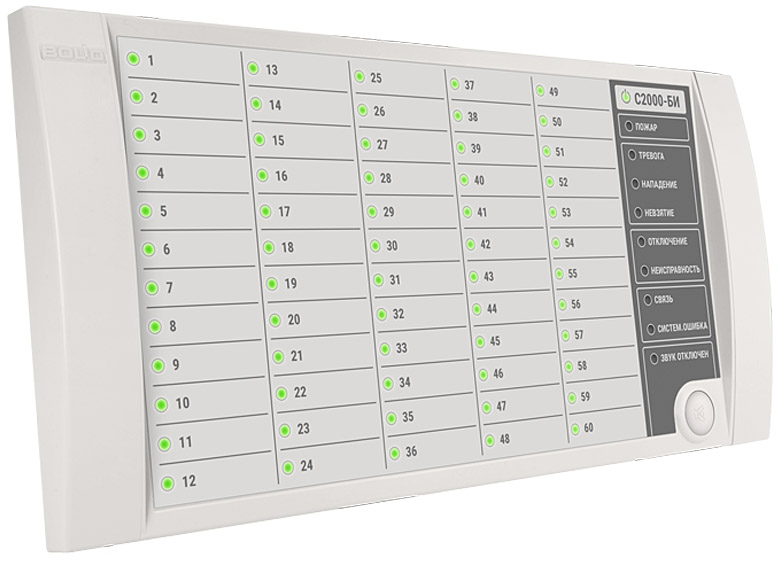 Раздельное отображение на 60 двухцветных индикаторах состояний контролируемых разделов: «Взят», «Взятие», «Снят», «Тревога», «Нападение», «Невзятие», «Пожар», «Внимание», «Неисправность», «Нарушение технолог. ШС», «Норма технолог. ШС», «Протечка», «Повышение/Понижение температуры», «Повышение/Понижение уровня», «Дверь Взломана», «Дверь Заблокирована», «Дверь Открыта/закрыта», «Доступ закрыт/открыт/в норме».