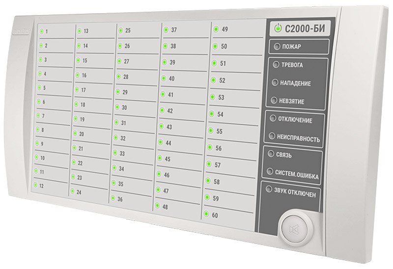 С2000-БИ 2хRS485 блок индикации; для работы в составе ИСО «Орион»; 60 индикаторов состояния разделов; включение звукового сигнала при получении тревожного сообщения; 8 индикаторов для отображения наличия тревог и неисправностей; 1 индикатор для отображения режимов работы блока; RS-485; 3 Вт; IР20; 30...+50°С; 340х170х27 мм; 0.6 кг.