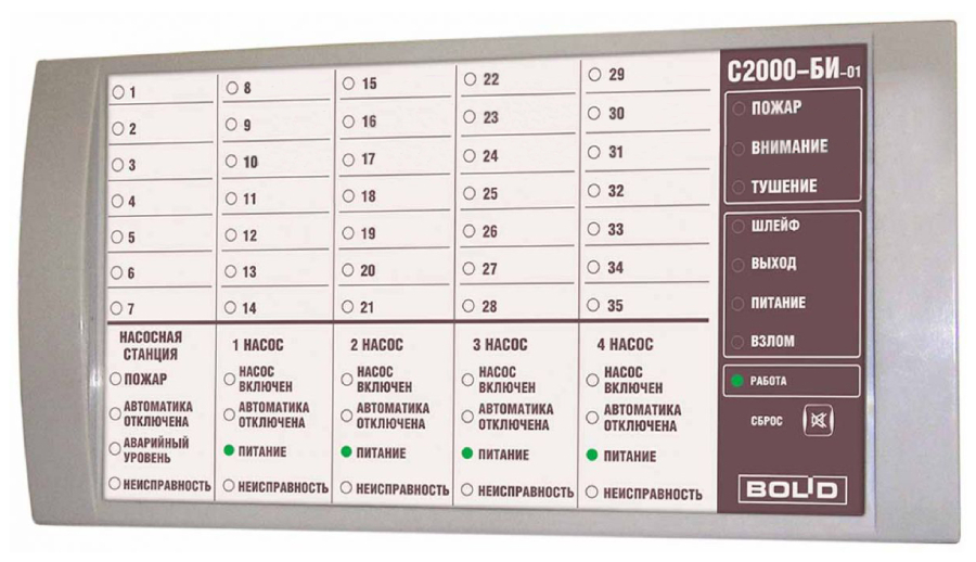 С2000 БИ исп.01 блок индикации Болид; 60 световых индикаторов; сообщение о вскрытии корпуса; включение звукового сигнала/ возможность его сброса оператором; программирование адреса прибора в системе; не менее 50 дБА; 10,2 ÷ 28,4 В; -30 +50 °C; IР20; 170x340x25,5 мм; 0,6 кг.