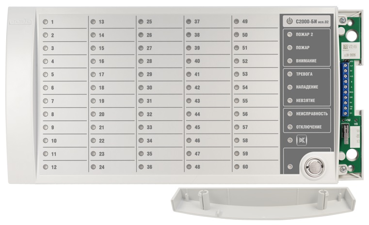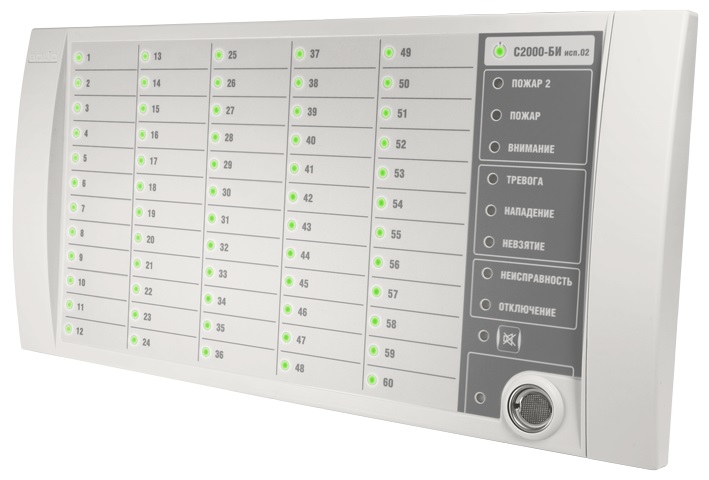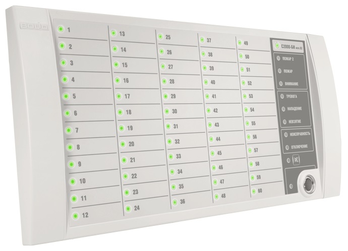 Раздельное отображение на 60 двухцветных индикаторах состояний контролируемых разделов: «Взят», «Взятие», «Снят», «Тревога», «Нападение», «Невзятие», «Пожар», «Внимание», «Неисправность», «Нарушение технолог. ШС», «Норма технолог. ШС», «Протечка», «Повышение/Понижение температуры», «Повышение/Понижение уровня», «Дверь Взломана», «Дверь Заблокирована», «Дверь Открыта/закрыта», «Доступ закрыт/открыт/в норме»