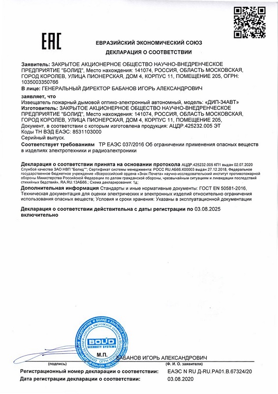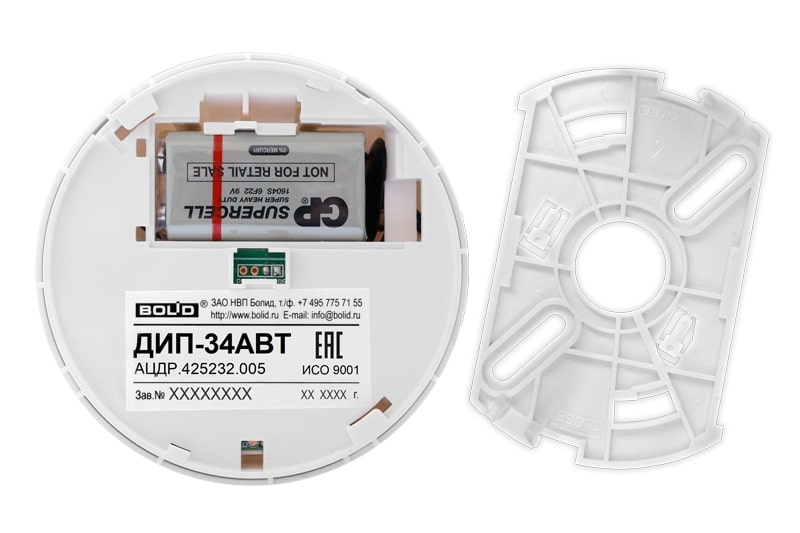 ДИП-34АВТ извещатель пожарный дымовой оптико-электронный Болид; 0,05 до 0,2 дБ/м; батарея 6F22 9v ("Крона"); IP41; от -10 до +50 °С; 35ר102 мм; 0,1 кг.