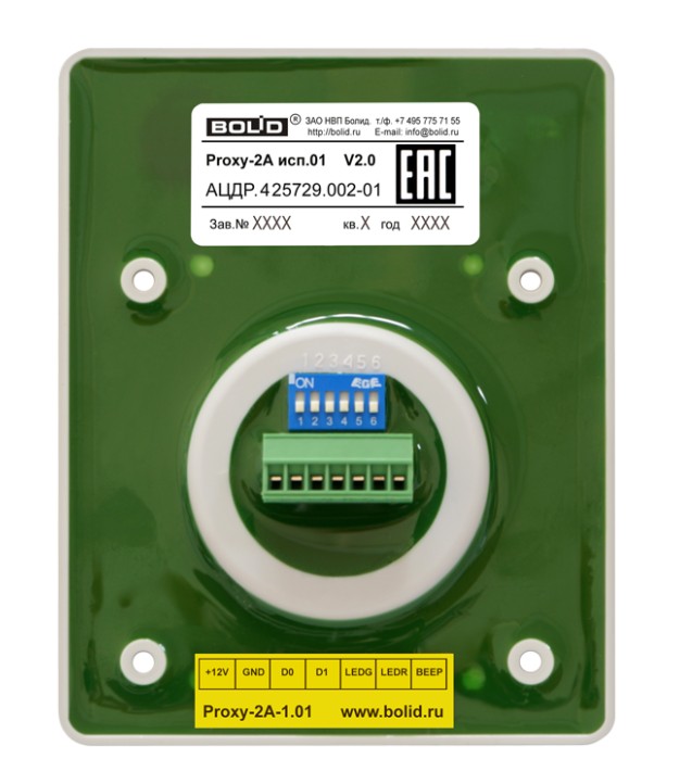 Proxy-2А (Proxy-2А исп. 01) считыватель бесконтактный Болид; EM-Marin; HID ProxCard II; интерфейс Dallas Touch Memory; RS-232 ТТЛ; RS-232/DATA; Wiegand-26, Wiegand-37, Wiegand-44; ABA TRACK II; U-пит. 8...15 В; I-потр. 100 мА; IP20; t-раб. -25...+60 °С; 123х97х14 мм; 90 г.